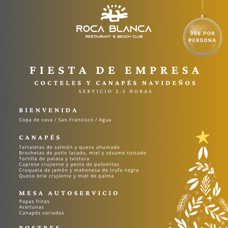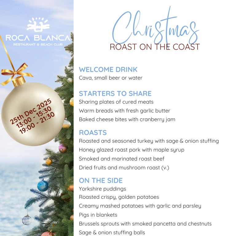 Todo lo que buscas para tu comida o cena tradicional de Navidad — con todos los acompañamientos, vistas al mar y el ambiente único de Roca Blanca. Plazas limitadas, reserva por email.